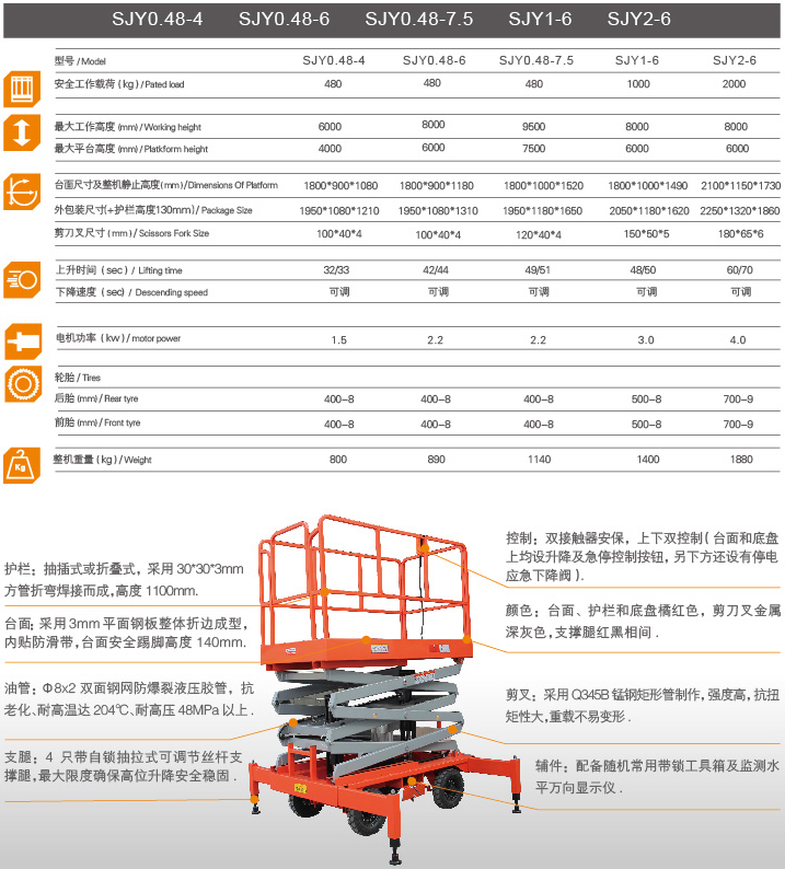 移動(dòng)剪叉式高空作業(yè)平臺(tái)采用全錳鋼剪刀式機(jī)械結(jié)構(gòu),使升降臺(tái)起升后有很高的安全穩(wěn)定性,寬大的作業(yè)平臺(tái)和較高的承載能力,也使高空作業(yè)范圍更大,效率更高,并適合多人同時(shí)作業(yè)。